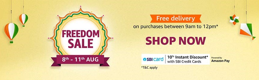 The Amazon Freedom Sale 2020 is live now and will be valid until 11th August 2020. During the sale get up to 70% off on top branded products on Mobile, Electronics, Home & Kitchen, Fashion & more. Avail 10% instant discount on SBI Credit cards & EMI.