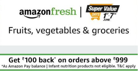 Shop for INR 999 and above from eligible products on Amazon Fresh, get INR 100 cashback as Amazon Pay balance, eligible to be claimed maximum of INR 100 Cashback during the offer period, credited within 24 hours from order delivery. The offer is eligible only on orders placed through Amazon Pay payment method.