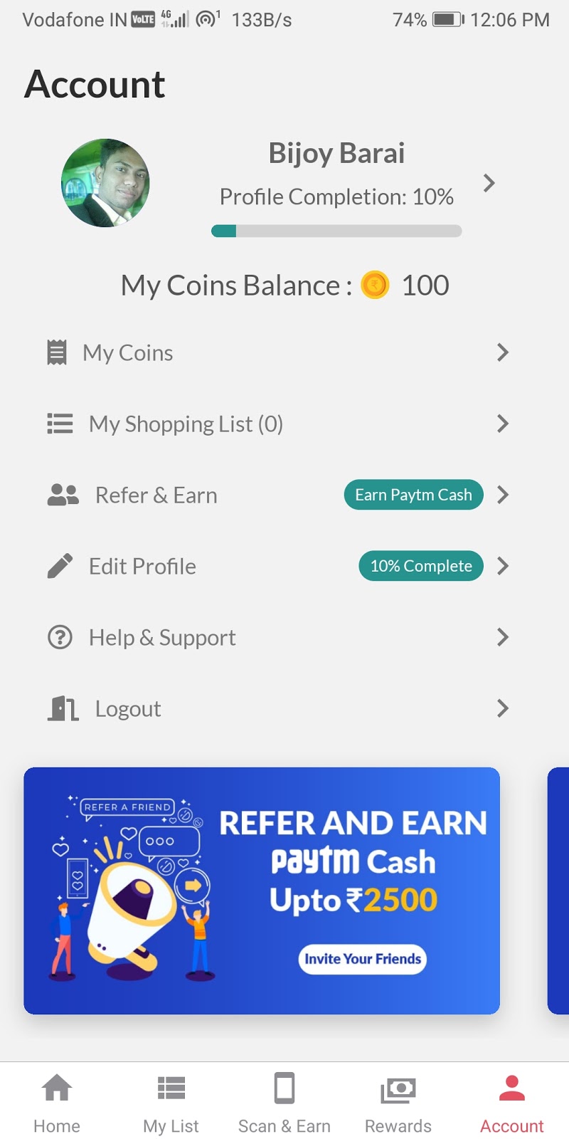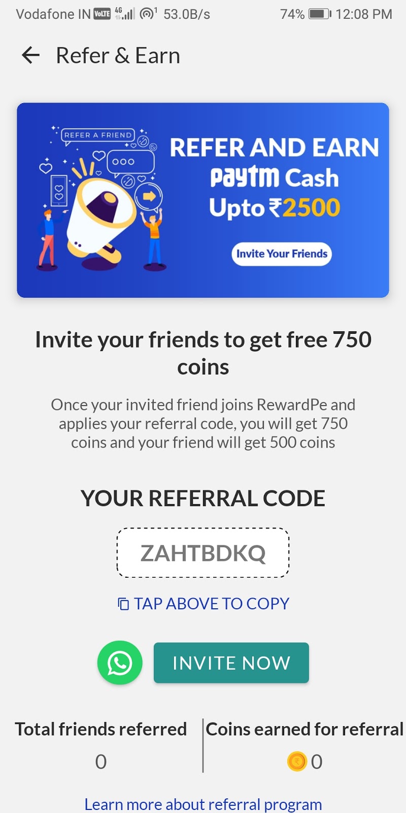 7) Now go back to refer and earn option share your referral code you will get 750 coins worth Rs.7.5 per refer