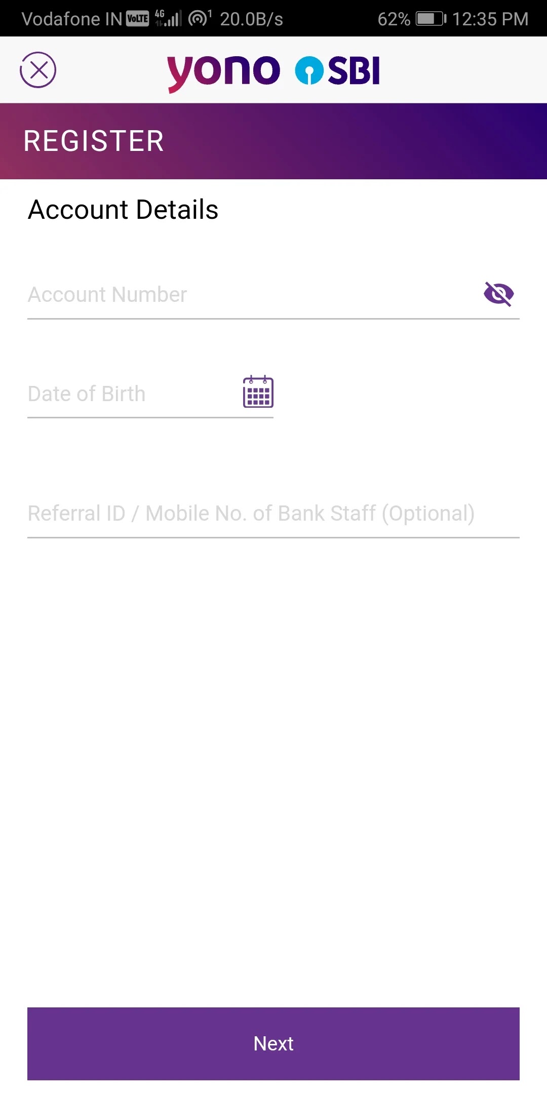 6) So enter your SBI account number, Date of birth (Referral Code Is Optional) and click next